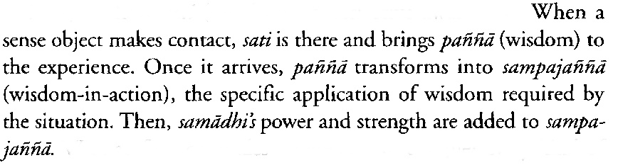 "If the term sampajanna is translated too concisely into English its meaning can be lost. It has usually been translated as "clear comprehension," "bare comprehension," etc.